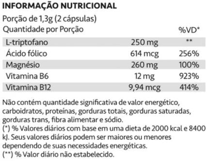 - Ingredientes: L‑Triptofano, ácido fólico, magnésio, vitamina B12, vitamina B6 e excipientes.