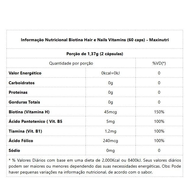 - Fórmula com biotina: biotina é componente nutricional associado à manutenção da estrutura capilar e das unhas quando integrada à dieta.