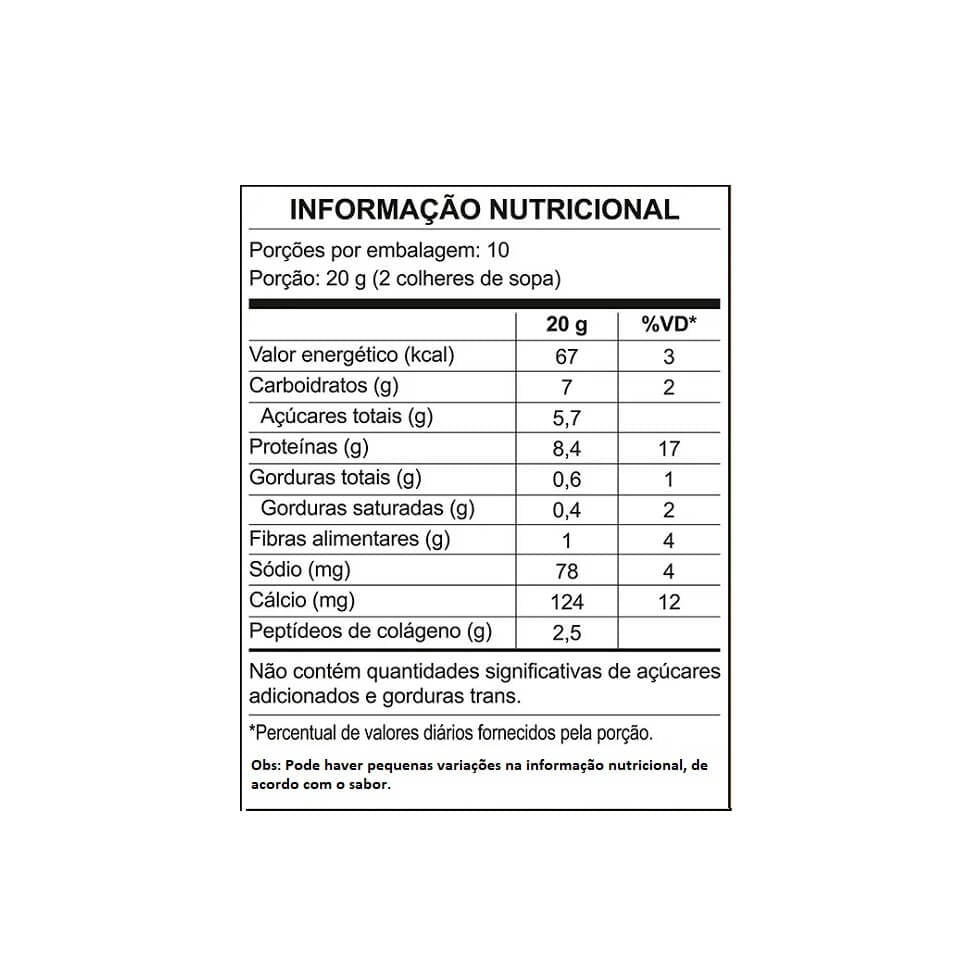 Fórmula composta por whey protein (WHEYDOP) e colágeno Verisol, com textura aveludada e preparo versátil quente ou frio. Fornece proteínas por porção e contribui com 2,5 g de colágeno Verisol, além de 125 mg de cálcio. Zero adição de açúcares, o que facilita a inclusão em dietas com controle calórico. Ideal para complementar estratégias de hipertrofia e recuperação muscular.