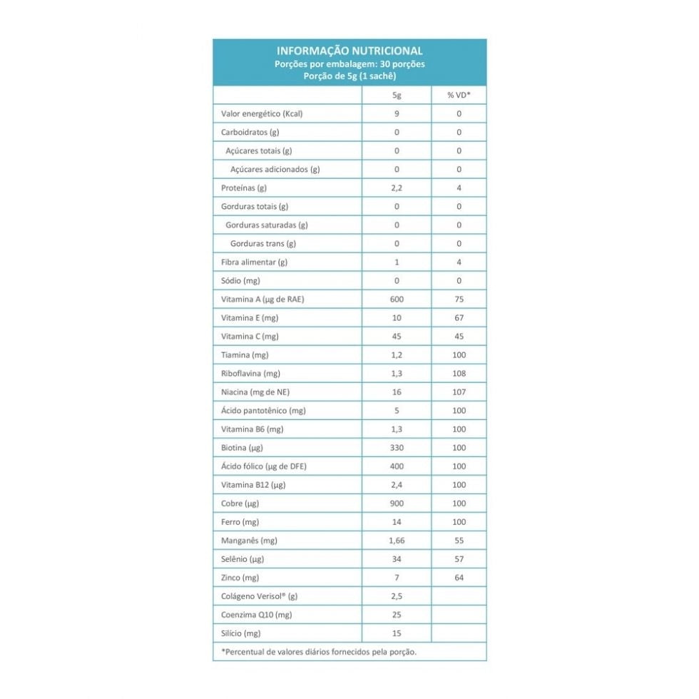 Formulação com peptídeos de colágeno VERISOL, coenzima Q10, biotina, ácido fólico, silício e um conjunto de vitaminas e minerais como cobre, selênio, zinco e manganês. Os sachês de 5 g oferecem dosagem prática e fácil diluição. A composição visa apoiar a integridade dos tecidos e a aparência corporal sem fazer alegações terapêuticas, atuando como complemento à dieta.