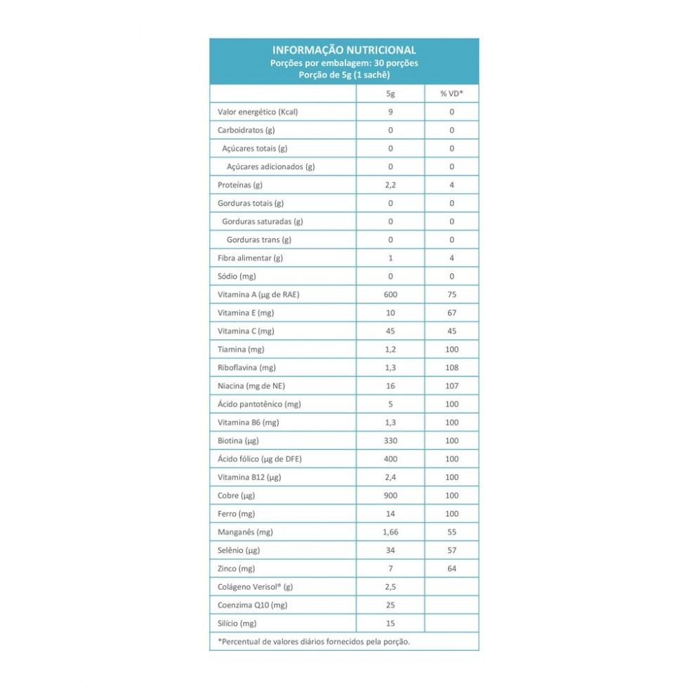 - Ingredientes: Colágeno hidrolisado (VERISOL), coenzima Q10, biotina, ácido fólico, vitaminas e minerais (silício, cobre, selênio, zinco, manganês) e excipientes.