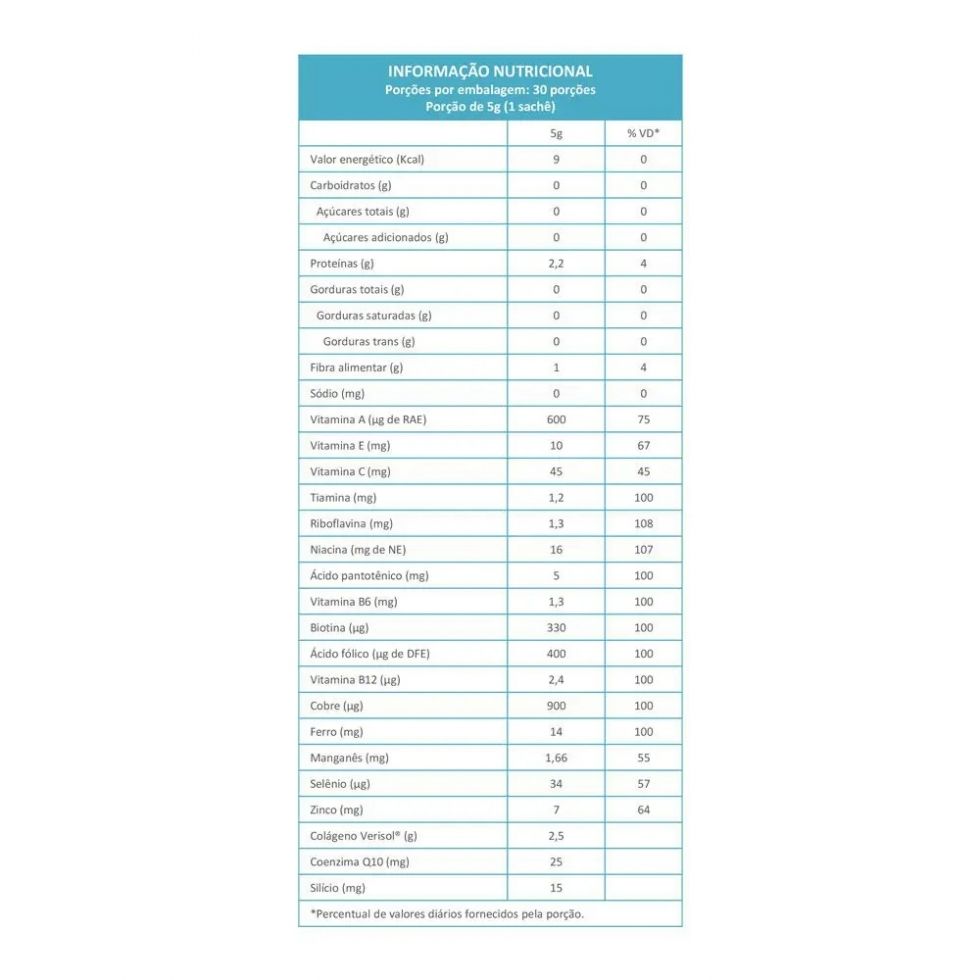 - Ingredientes: Peptídeos de colágeno VERISOL, coenzima Q10, biotina, ácido fólico, silício, cobre, selênio, zinco, manganês e 17 vitaminas e minerais.