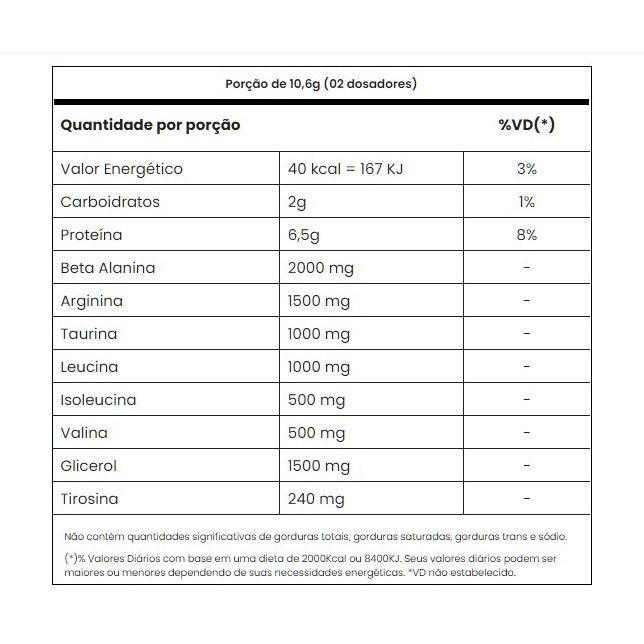 - Ingredientes: Arginina, beta-alanina, BCAA’s, taurina, glicerol em pó, tirosina e outros aminoácidos (ver rótulo).