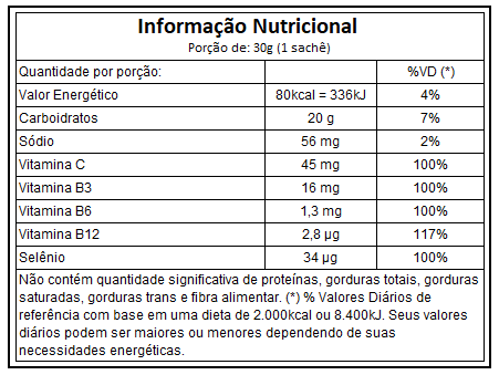 - Ingredientes: base de carboidratos, vitaminas (vitamina C, complexo B), minerais (sódio, selênio).