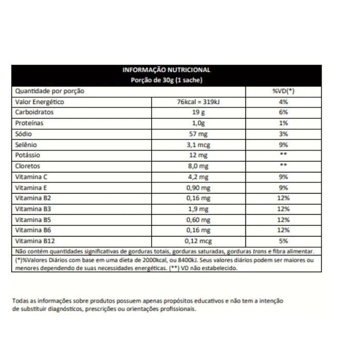 Porção: 30 g (1 sachê). Diluição: não se aplica — produto em gel para ingestão direta; pode ser acompanhado de água para hidratação. Frequência: consumir conforme necessidade energética durante treino ou competição. Timing: indicado antes ou durante exercícios de longa duração. Ajuste a quantidade conforme orientação de nutricionista.