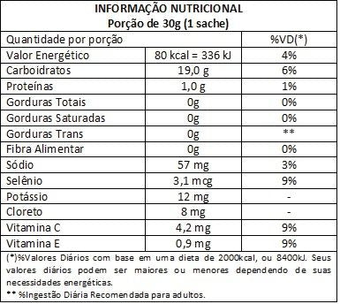 Porção: 30 g (1 sachê). Consumir conforme necessidade energética: antes de esforços de longa duração, durante exercícios prolongados ou logo após o treino para reposição rápida de carboidratos. Não requer diluição; abrir e ingerir diretamente. Ajustar frequência conforme intensidade do treino e orientação de nutricionista.