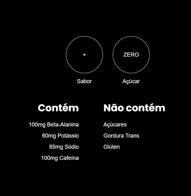 - Ingredientes: Blend energético com Beta-Alanina, Cafeína, Sódio e Potássio (conforme embalagem).