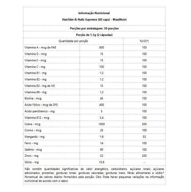 O HairSkin e Nails Supreme, da MaxiNutri, é um suplemento formulado para apoiar a saúde de cabelos, pele e unhas. Indicado para quem busca fortalecer fios, melhorar hidratação e reduzir a quebra. Pode ser inserido na rotina diária de cuidados e como parte de programas de recuperação estético-nutricional.