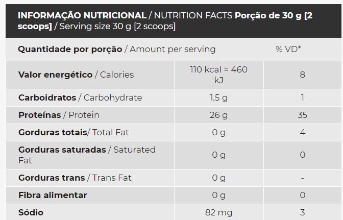 - Ingredientes: Whey Protein Isolate (proteína isolada do soro do leite)