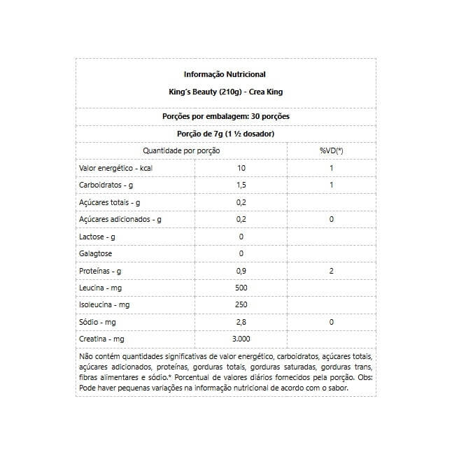 King´s Beauty da Crea King é um suplemento pensado para praticantes de treino de força que buscam melhorar a recuperação muscular e apoiar objetivos de hipertrofia com benefícios estéticos. Combina creatina, colágeno hidrolisado e BCAA em fórmula única, com sabor frutas vermelhas para consumo diário prático.