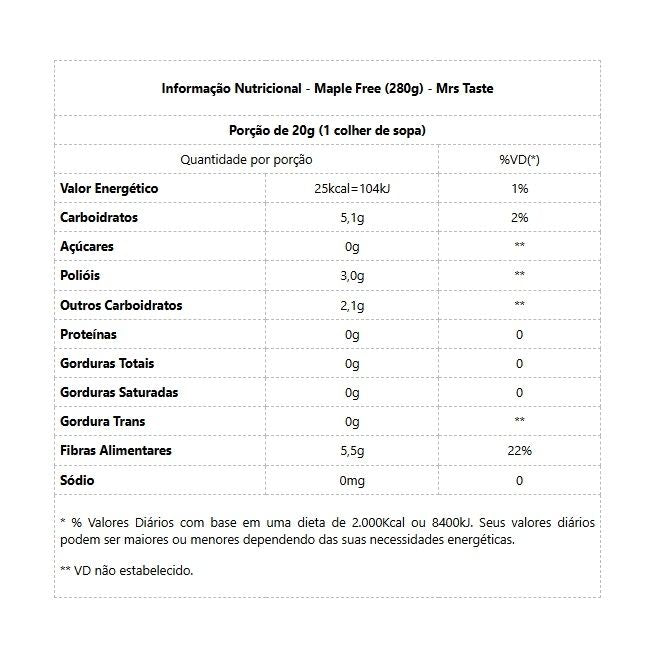 Maple Free da Mrs Taste é uma calda sabor maple com baixo teor de açúcares, adoçada com estévia e formulada com maltitol e xarope de isomalto‑oligossacarídeos. Indicado como alternativa aos xaropes convencionais para quem busca reduzir açúcares em receitas e preparos relacionados ao treino, pré-treino e suplementação caseira.