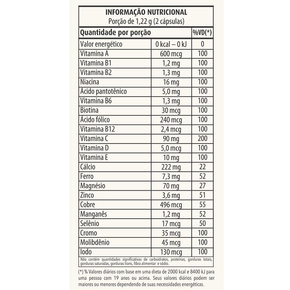 - Destaques: fórmula cobrindo de A ao Zinco, prática para uso diário.