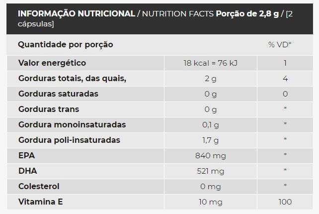 Formulado com óleo de peixe rico em EPA e DHA, o produto entrega os ácidos graxos na forma TG, favorecendo a absorção. A vitamina E foi adicionada para ajudar a proteger os lipídeos da oxidação. Este suplemento atua como complemento à alimentação e pode contribuir para a manutenção de uma rotina de treino e recuperação muscular.