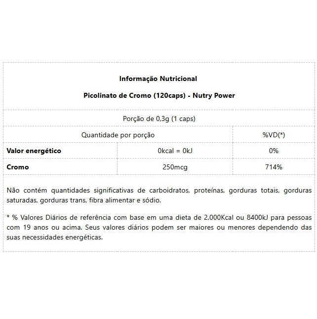 O produto contém picolinato de cromo, uma forma de cromo frequentemente utilizada em suplementação para fornecer o mineral-traço de maneira biodisponível. O cromo participa do metabolismo de carboidratos e pode apoiar a sensibilidade insulínica, o que auxilia a utilização de glicose pelo organismo. Fórmula simples e prática, fácil de incluir na rotina diária de suplementação para atletas e praticantes de atividade física.