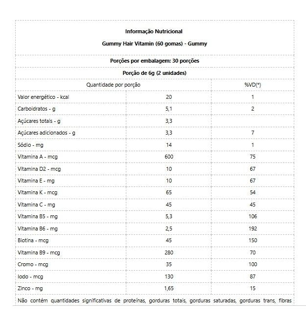 Gummy Hair é um suplemento em gominhas que reúne Biotina, Retinol, Vitamina C, Ácido Fólico e Zinco para apoiar a saúde de cabelo, pele e unhas. Indicado para quem busca praticidade na suplementação diária e quer complementar a rotina de cuidados pessoais, podendo ser incorporado a planos de treino e alimentação voltados para desempenho e recuperação.