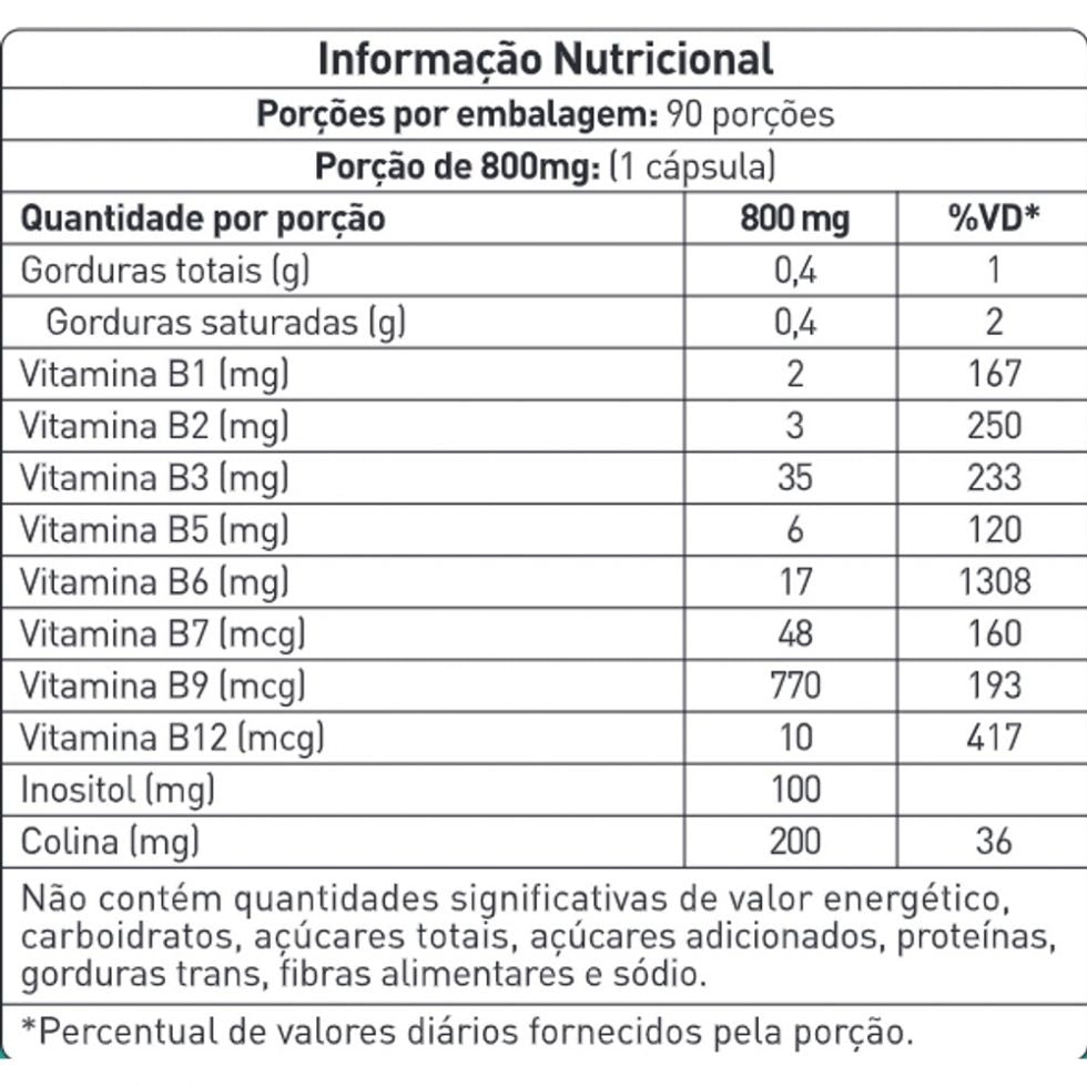 - Ingredientes: Vitaminas do complexo B (B1, B2, B3, B5, B6, B7, B9 e B12), colina, inositol e excipientes (conforme rótulo).