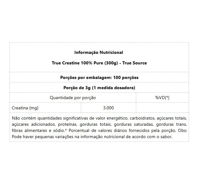 O True Creatine 100% Pure da True Source é um suplemento em pó composto por creatina pura, indicado para praticantes de musculação e treino de força. Formulado para oferecer creatina de alta pureza, pode contribuir para aumento da força, apoio à recuperação muscular e melhora do desempenho em atividades de alta intensidade.