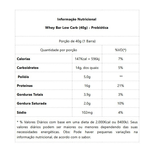 - Baixo carboidrato: opção prática para controle de ingestão de carboidratos ao longo do dia.