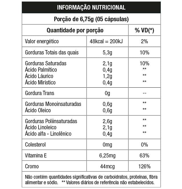 - Ingredientes: Ômega 3, 6 e 9 de fontes vegetais; vitamina E; picolinato de cromo; cápsula softgel.